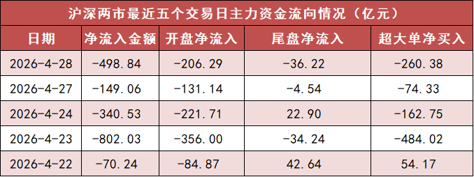 今日沪深两市主力资金开盘净流出206.29亿元,尾盘主力资金净流出36.22亿元,两市全天主力资金净流出498.84亿元。